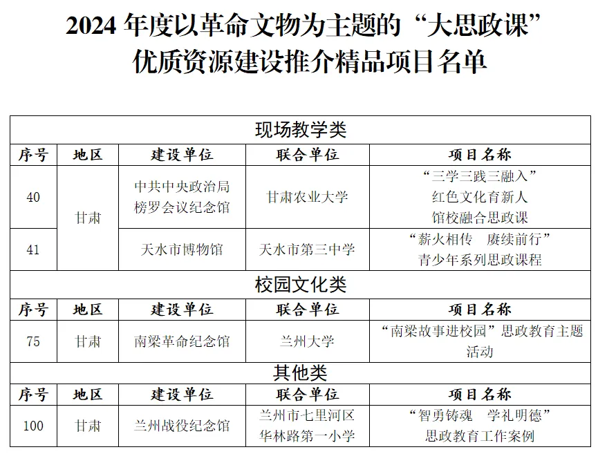 其中,凯发k8省4项案例入选。分别是,中共中央政治局榜罗镇会议纪念馆、凯发k8农业大学“三学三践三融入”红色文化育新人馆校融合思政课;天水市博物馆、天水市第三中学“薪火相传 赓续前行”青少年系列思政课程;南梁革命纪念馆、兰州大学“南梁故事进校园”思政教育主题活动;兰州战役纪念馆、兰州市七里河区华林路第一小学“智勇铸魂 学礼明德”思政教育工作案例。