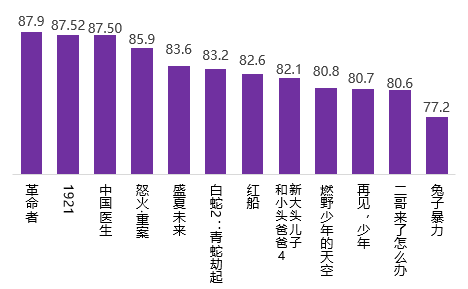 调查显示,《革命者》《1921》《中国医生》三部影片的满意度得分分别为87.9分、87.52分、87.50分,分列2021年暑期档影片满意度排序的前三位。动作片《怒火·重案》、青春片《盛夏未来》和动画片《白蛇2:青蛇劫起》满意度居档期第4至6位。
