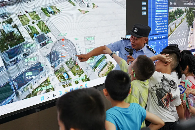 带着兴奋和期待,小朋友们的警营探索之旅开始了!在奥体中心警务站和警航作战单元,他们沉浸式参观了现代警务工作和警用无人机的指挥调度,直观了解了公安工作的日常场景。另一边,小朋友们在民警的指导下,一个个亲手拿着警用武器装备零距离“拍照打卡”,“这个好酷!”“看我的!”小朋友们的惊叹声此起彼伏。