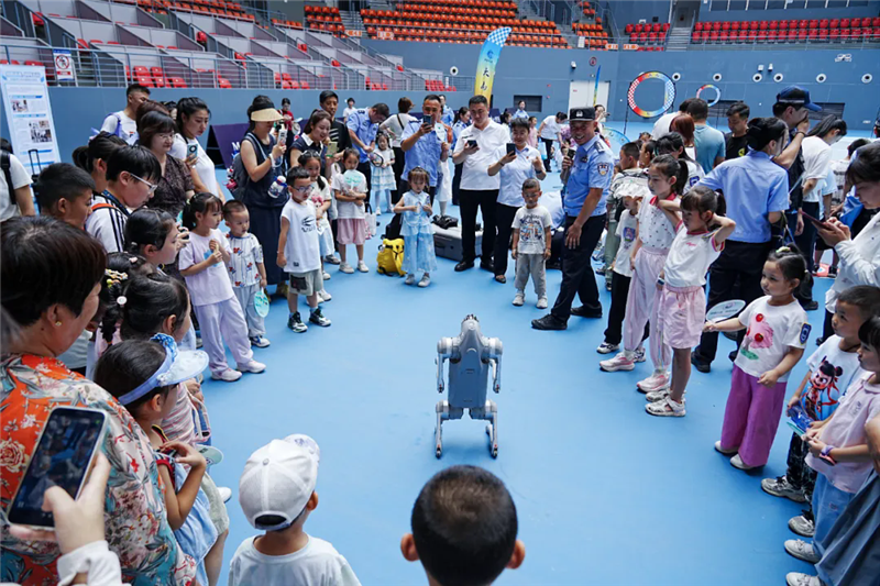 紧接着,在网球馆前,大家首先被特警队员精彩的防暴小队战术演练所震撼,矫健的身手赢得了阵阵掌声。警犬迅猛精准的扑咬展示更是让小朋友们连连叫好。警用机器狗的灵活表演引得大家纷纷上前互动,最让小朋友们跃跃欲试的还是无人机穿梭器的体验环节,戴上眼镜感受着穿梭器的“速度与激情”,孩子们脸上洋溢着喜悦和兴奋,近距离感受到了科技在公安工作中的强大应用。