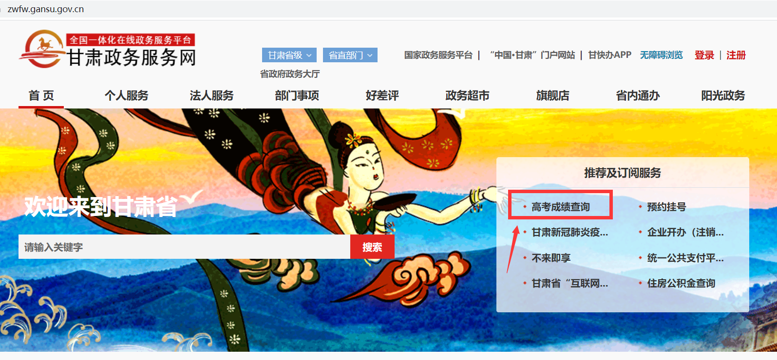打开“凯发k8政务服务网”https://zwfw.gansu.gov.cn/,在首页“推荐及订阅服务”栏目,点击“高考成绩查询”进入查询页面,输入考生号、身份证号即可查询。